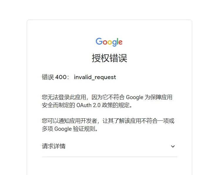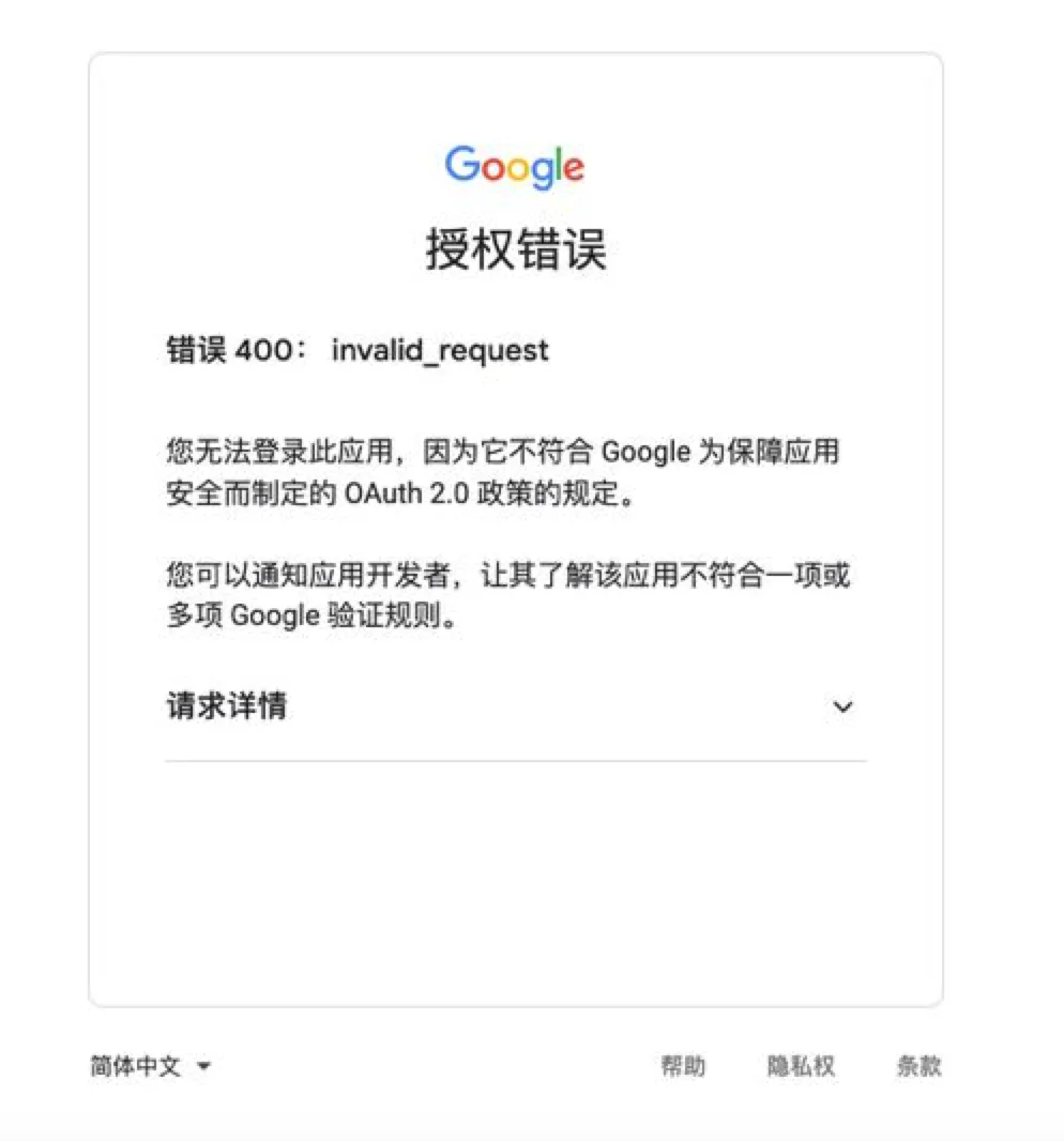 如果你在这一步遇到了 400 或者 403 错误,那有可能是你发布的应用没被审核的缘故(别问,问就是不知道为啥 google 改了政策还是我这边网络延迟还是其他奇奇怪怪的问题)。如下图: