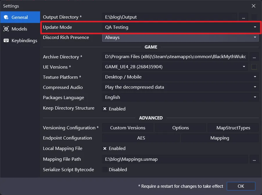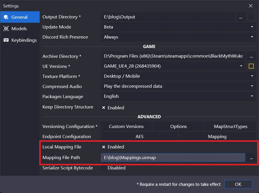再次打开 FModel,点击上方的 Settings,将红色框内圈起来的地方修改为你上文中 dump 出的 Mappings.usmap 的路径并点击确定: