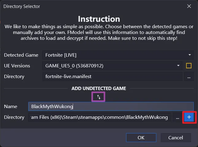 打开 Fmodel,并点击紫色按钮,然后按照我下图这样填写后点击红色框里的加号:
